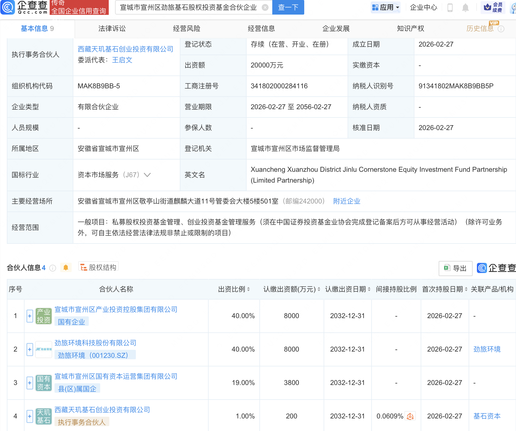 近日,宣城市宣州区劲旅基石股权投资基金合伙企业(有限合伙)成立,出资额2亿元,经营范围包含:私募股权投资基金管理、创业投资基金管理服务。企查查股权穿透显示,该企业由劲旅环境(001230)等共同出资。